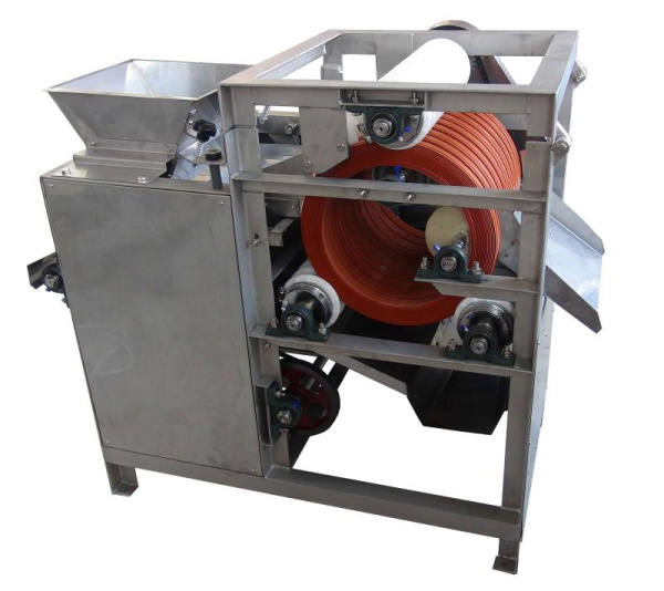 將經(jīng)浸泡的蠶豆倒入料斗,經(jīng)震動進(jìn)料使原料進(jìn)入由三個動力輥固定的旋轉(zhuǎn)膠輪之間的夾縫,在進(jìn)料輪的作用下,經(jīng)過刀片將原料外皮切口,然后由出料輪排出。