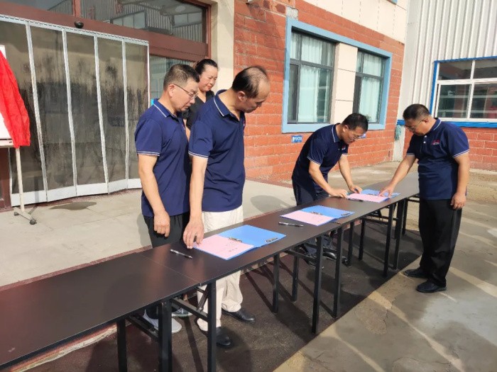 大會第三項,技術部王總監、銷售部姜經理、制造部于經理簽署軍令狀,他們將責任扛在肩上,以實際行動為茂源的發展全力以赴。簽完后,三位領導將軍令狀置于胸前,留下了莊重的一刻。